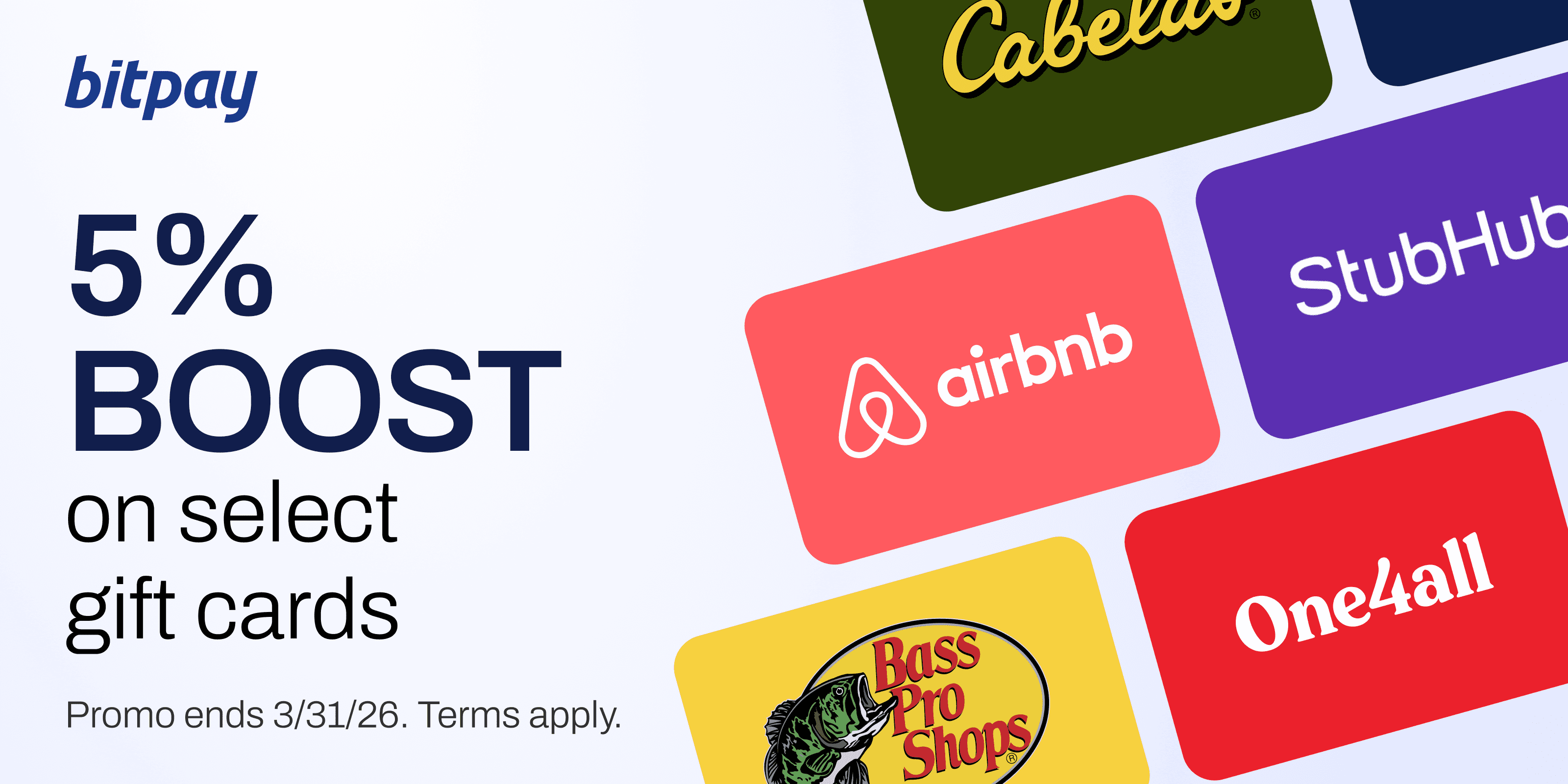 Now, through the end of February, get 5% more when you buy select gift cards with crypto in the BitPay app! Use your favorite coins to score extra value on brands including Bass Pro Shop, Cabela’s, AirBNB, StubHub, and One4all. Terms and conditions apply.