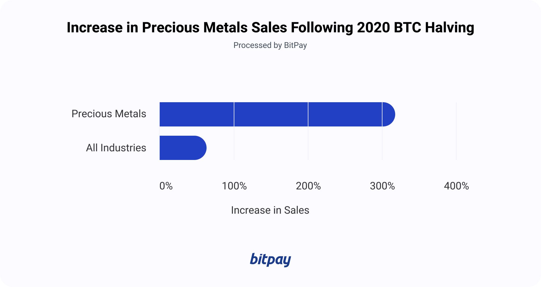 Precious Metals retailers enjoyed a big year following the last halving, with over 300% in crypto transactions. Some crypto consumers prefer to diversify their assets and build a sizable collection of precious metals.