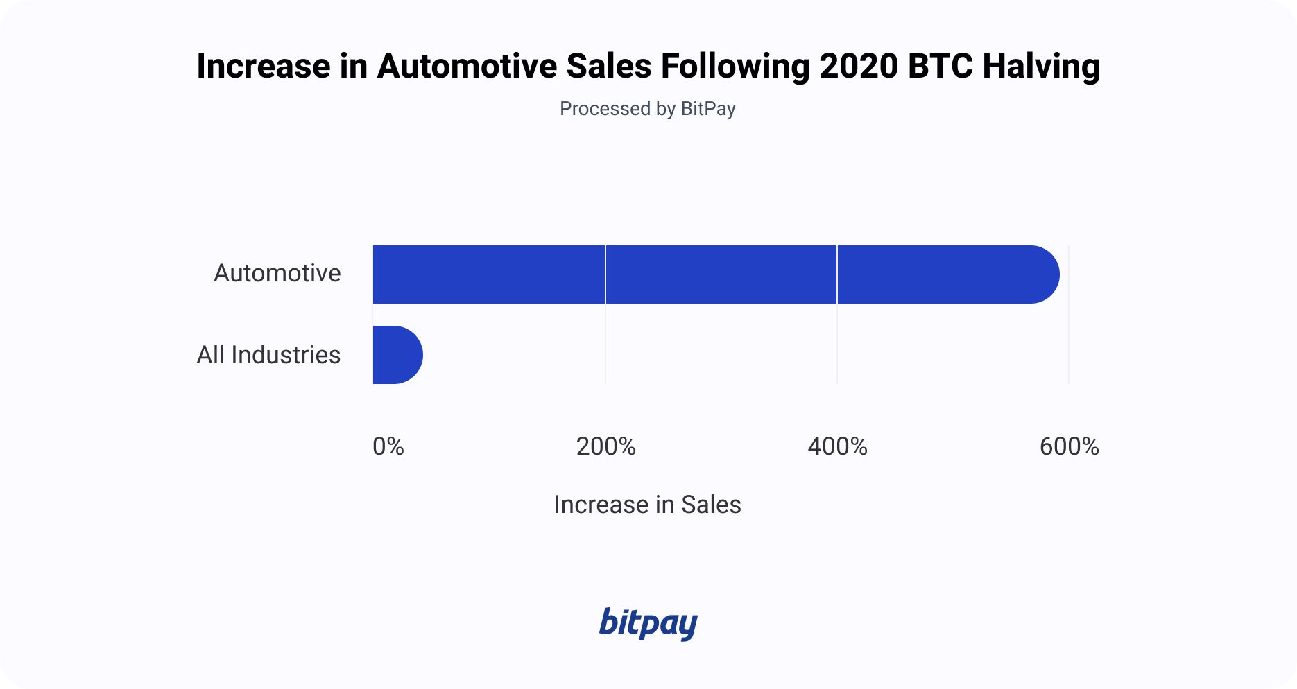 Automotive industry crypto transactions shot up almost 600% following the last halving event. In the spirit of cryptocurrency fundamentals, crypto consumers are keen on rejecting traditional banking methods when making large ticket purchases like vehicles, making the two a perfect fit.