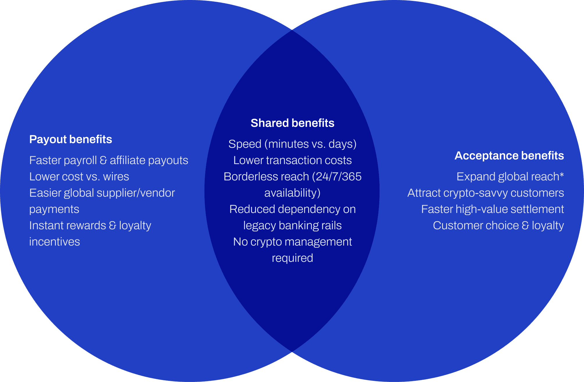 Settlement | Delays from intermediaries | Payments settle on-chain |